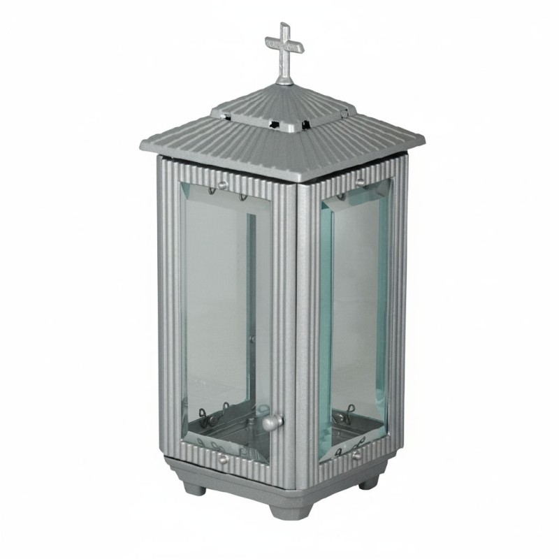 Lanterna em alumÃnio com estrutura na cor cinza. Apresenta um design moderno e resistente, ideal para utilização em exteriores. Com 31 cm de altura e 13 cm de largura, oferece proporções elegantes e boa estabilidade, garantindo uma presença discreta e cuidada no memorial. Uma opção duradoura, leve e esteticamente harmoniosa para iluminações simbólicas.