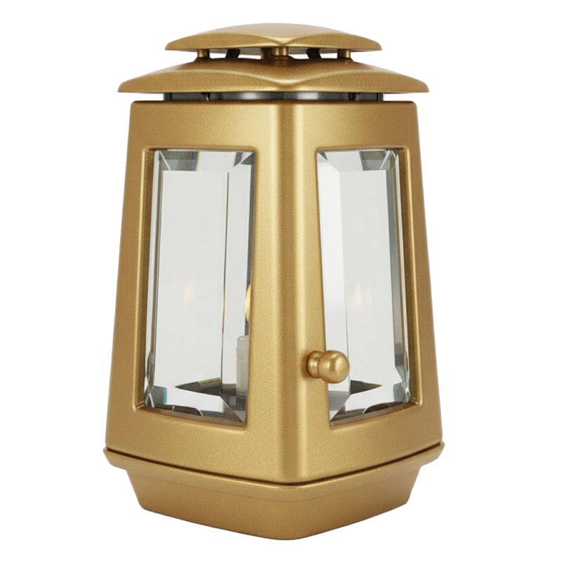 Lanterna em alumínio, com estrutura na cor bronze. Produzida em material leve e resistente, garante boa durabilidade em ambientes exteriores. Com 17 cm de altura e 13 cm de largura, apresenta um formato compacto e elegante, ideal para proporcionar iluminação simbólica discreta e harmoniosa no memorial. Uma opção prática e esteticamente equilibrada.