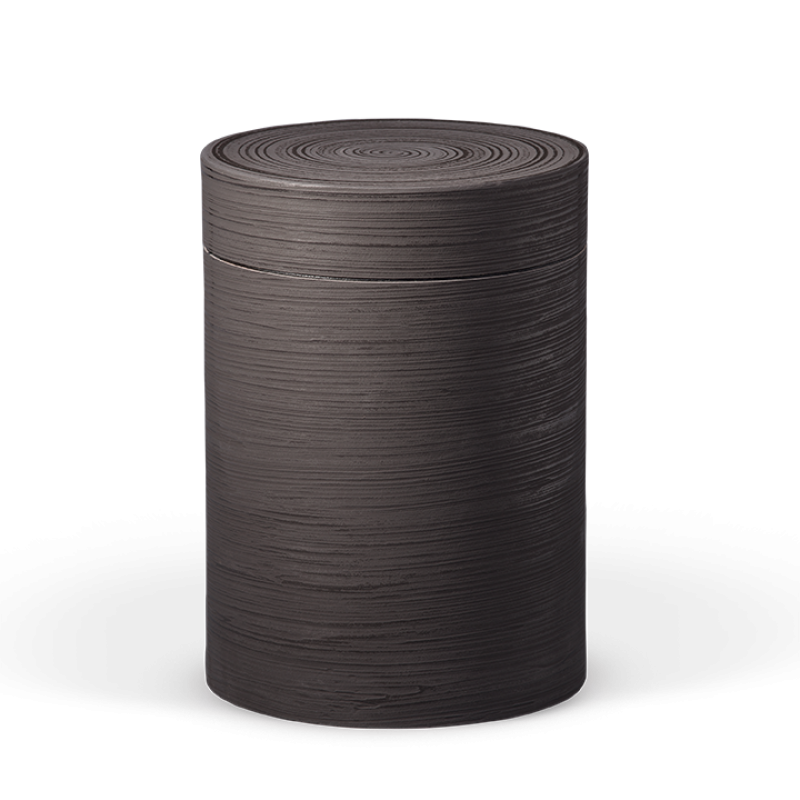 A urna ecológica possui uma superfície preta e um friso decorativo em toda a sua circunferência. Essa combinação é muito elegante e minimalista.