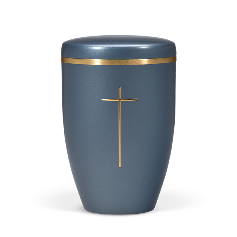 Urna azul em madrepérola com detalhes em dourado. Uma bela urna decorada com uma cruz e disponÃvel em duas cores. A urna é feita de um material ecológico. É ideal para ambientes internos ou para ser enterrada no solo externo. Com o tempo, esta urna e seu conteúdo serão absorvidos pelo solo.