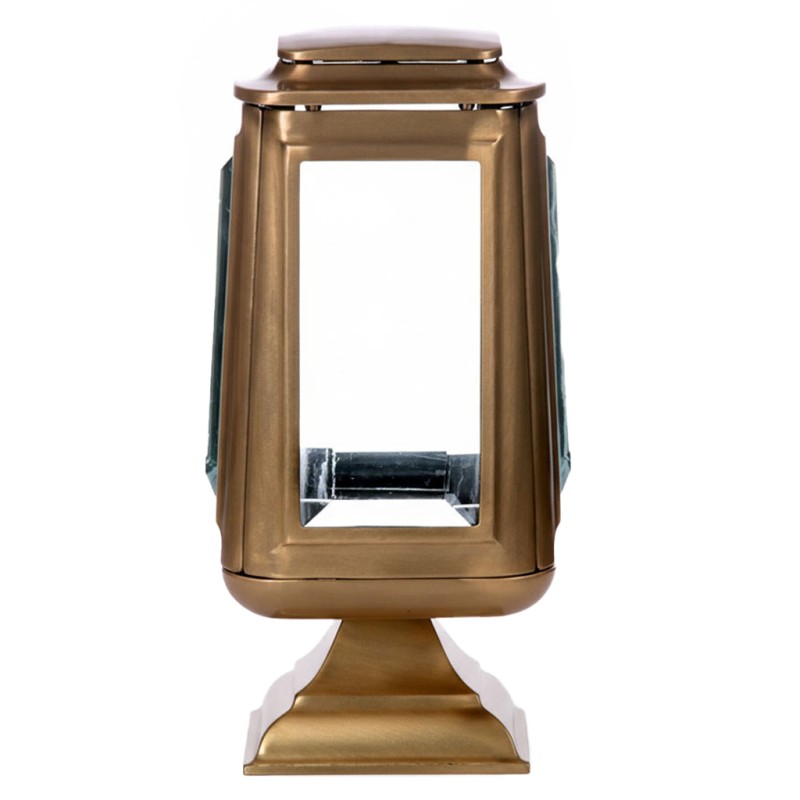 Lanterna funerária em bronze própria para instalação em terreno. Fabricada em bronze resistente, apresenta um aspeto sólido e intemporal, ideal para permanecer exposta ao exterior sem perder qualidade. Com 26 cm de altura, oferece uma presença marcante e garante uma iluminação simbólica constante, sendo uma escolha fiável para homenagens duradouras.