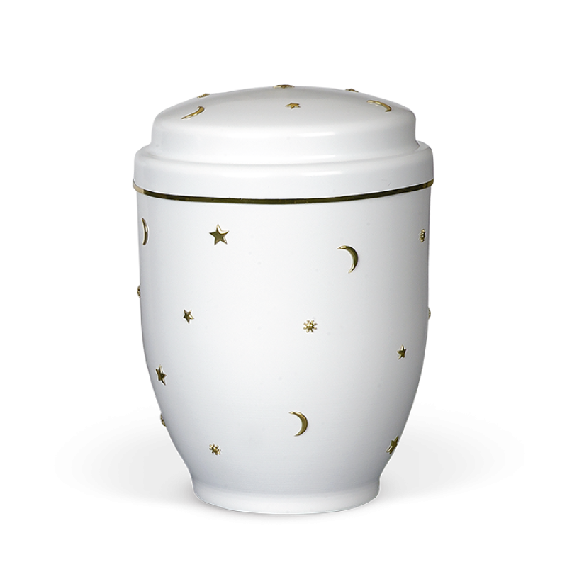 A urna " Céu Estrelado em Branco" é uma bela e delicada peça para guardar a memória de um ente querido. Esta urna possui base branca, detalhes em dourado. O motivo "Céu Estrelado em Branco", com estrelas e luas, cria uma atmosfera serena, acolhedora e, ao mesmo tempo, moderna.