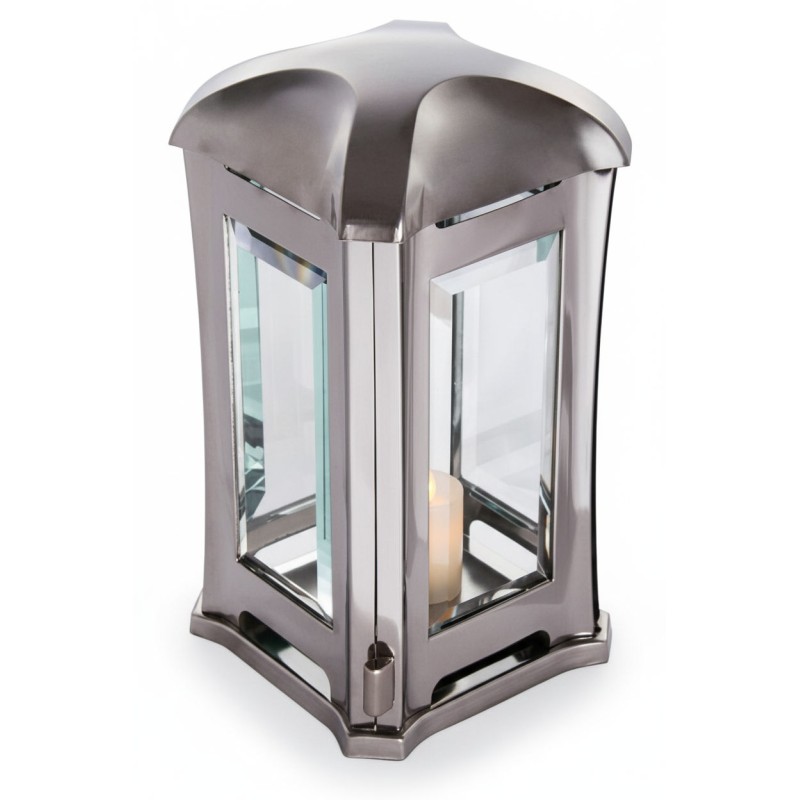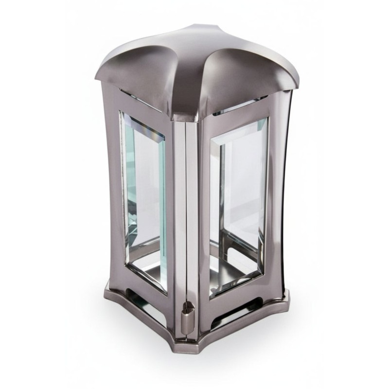 Lanterna funerária em inox para instalação em terreno, concebida para garantir estabilidade e resistência em ambientes exteriores. A construção em inox oferece durabilidade elevada e um aspeto moderno, mantendo a peça protegida contra as intempéries. Com 25 cm de altura, assegura uma iluminação simbólica contÃnua, ideal para homenagens cuidadas e discretas.