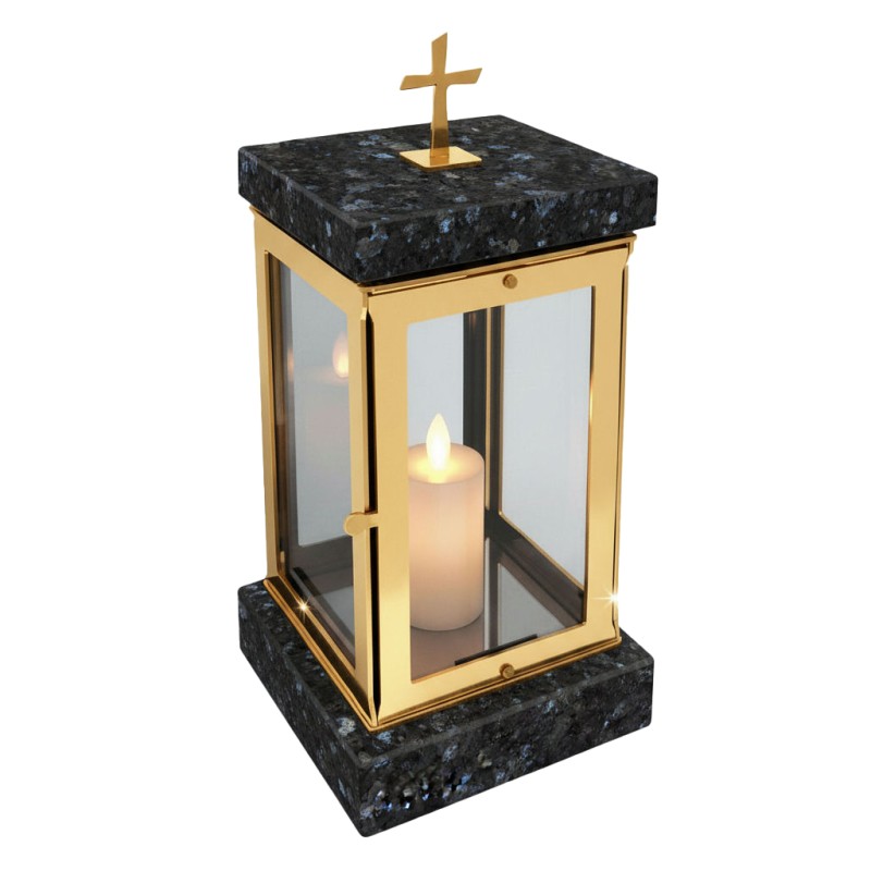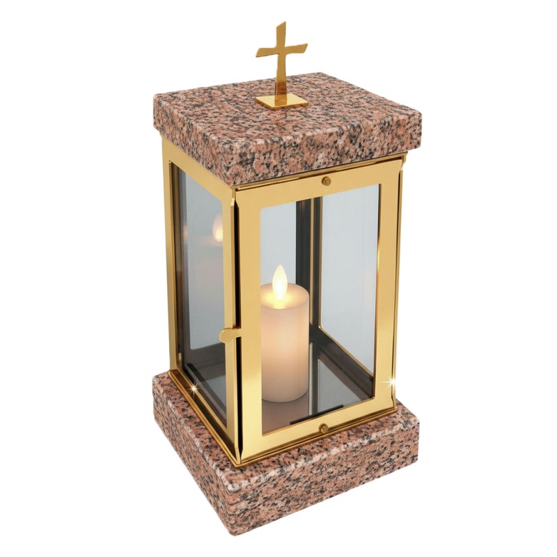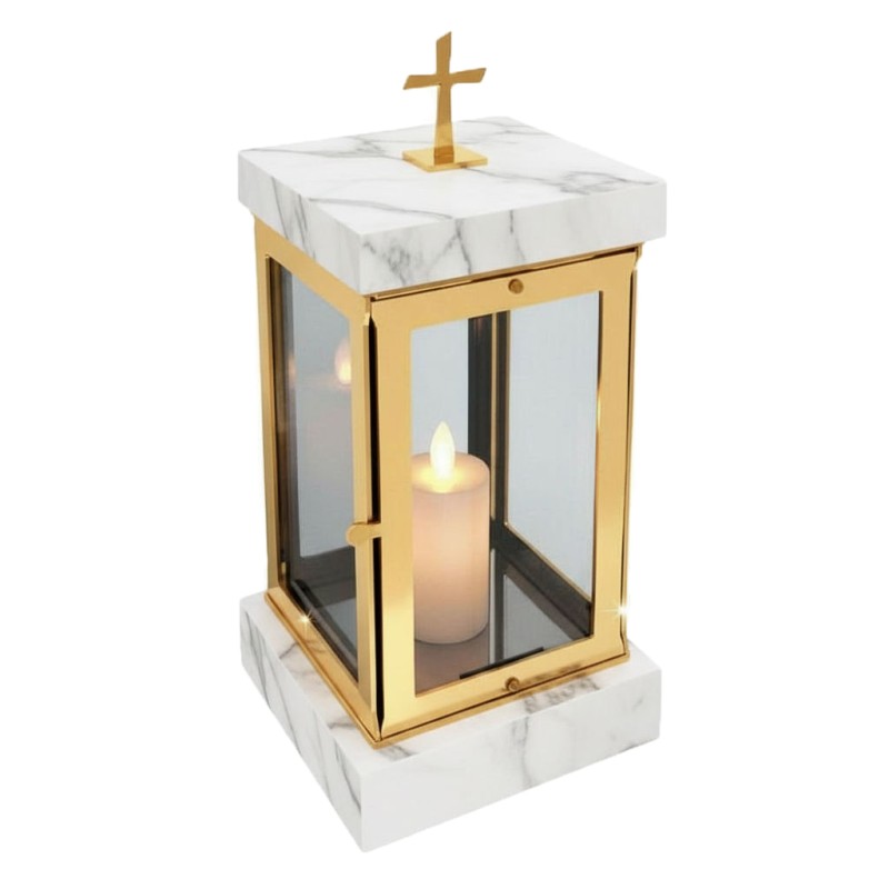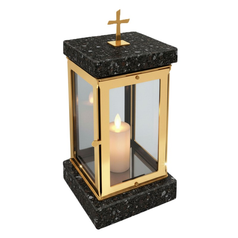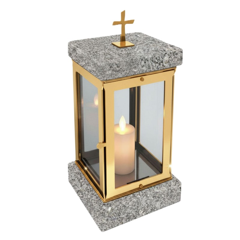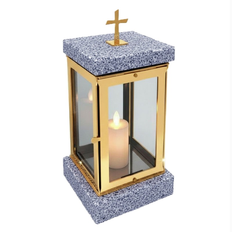 Lanterna funerária em inox, com estrutura complementada por pedra, combinando resistência e um acabamento visual mais decorativo. A construção em inox assegura durabilidade frente às intempéries, enquanto o detalhe em pedra confere um aspeto distinto e elegante. Com 22,5 cm de altura, é ideal para proporcionar uma iluminação simbólica e uma presença cuidada na campa.