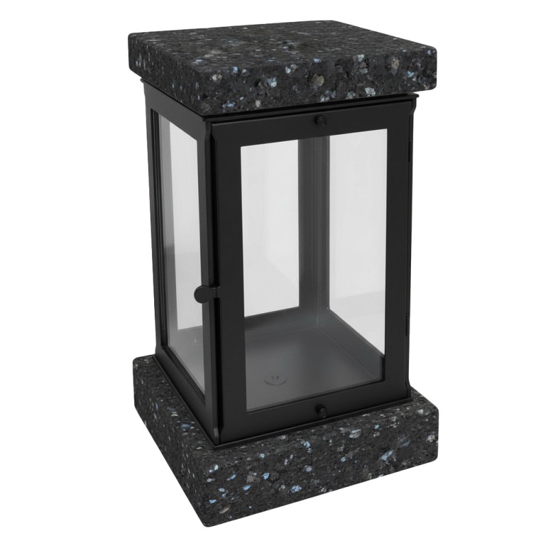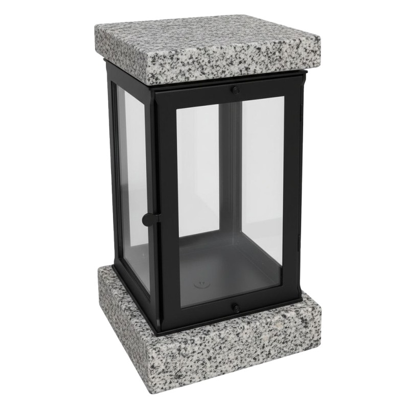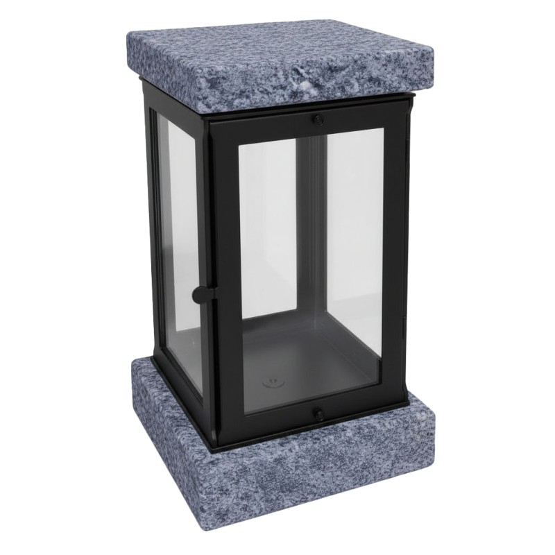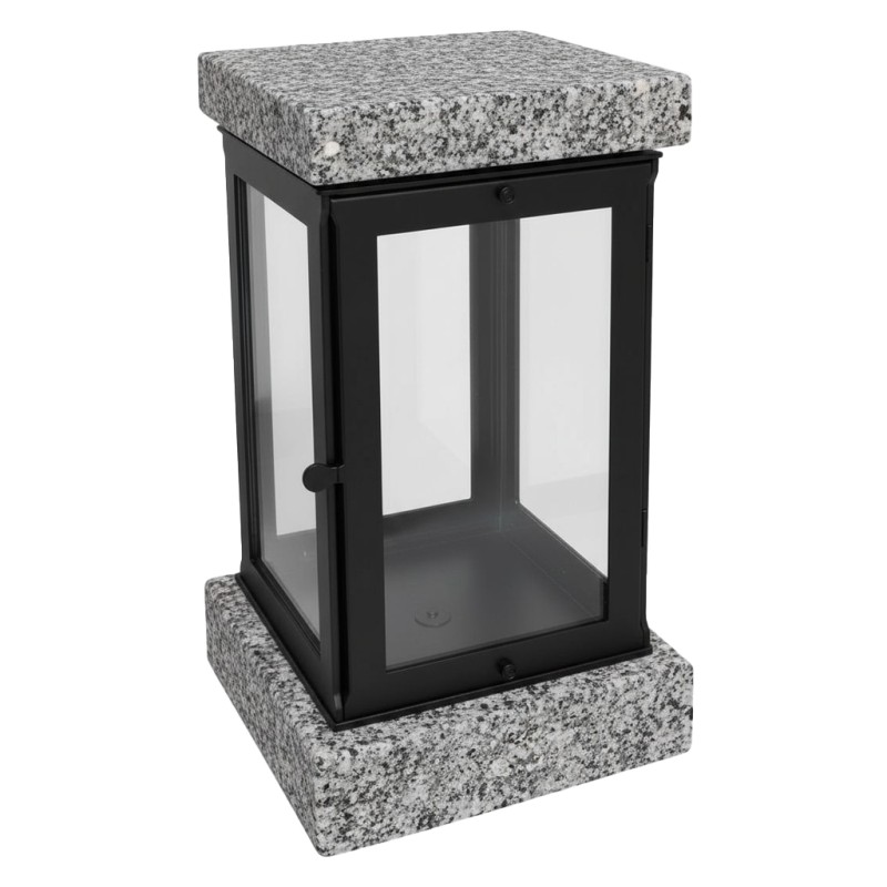 Lanterna funerária em inox, com estrutura complementada por pedra, combinando resistência e um acabamento visual mais decorativo. A construção em inox assegura durabilidade frente às intempéries, enquanto o detalhe em pedra confere um aspeto distinto e elegante. Com 22,5 cm de altura, é ideal para proporcionar uma iluminação simbólica e uma presença cuidada na campa.