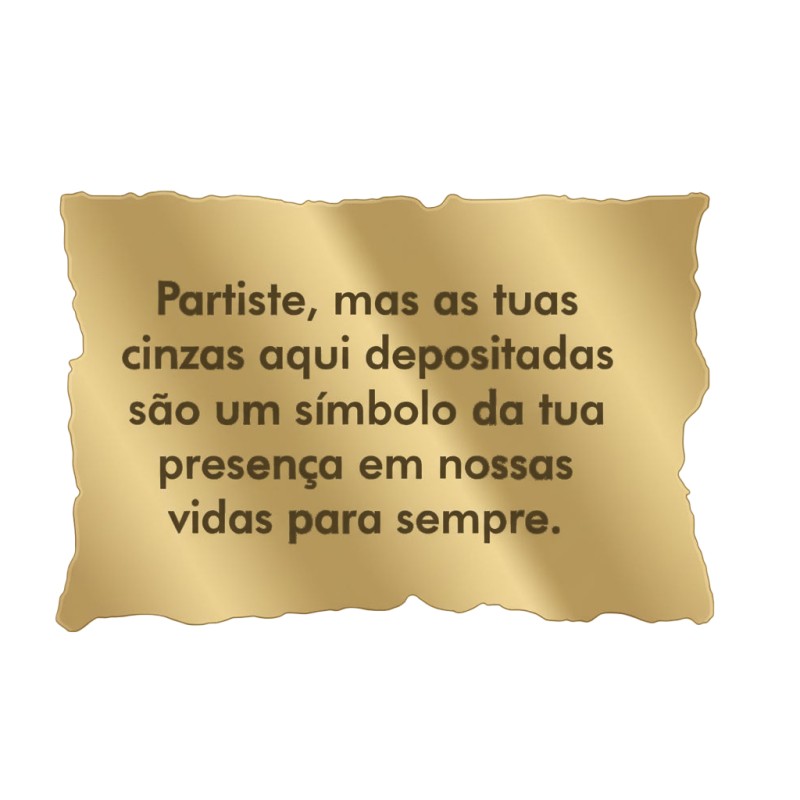 Chapa em inox com acabamento na cor dourado, com gravação personalizada, disponível com ou sem fotocerâmica. Produzida em inox resistente, é adequada para utilização em exterior, garantindo durabilidade e um aspeto moderno e discreto. A gravação pode ser adaptada às preferências do cliente, permitindo uma homenagem personalizada e cuidada.
