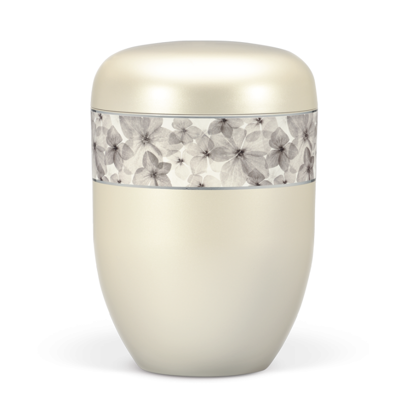 Urna em material natural branco creme com fita decorativa de flores. Esta urna combina uma elegância intemporal com um simbolismo profundo. A delicada fita decorativa retrata um conjunto de flores e pétalas com cores neutras. O motivo representa momentos serenos de recordação, conexão e eternidade.
