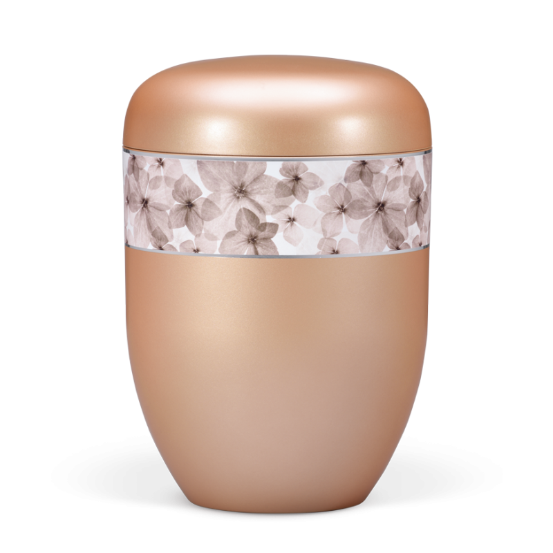 Urna em material natural damasco com fita decorativa de flores. Esta urna combina uma elegância intemporal com um simbolismo profundo. A delicada fita decorativa retrata um conjunto de flores e pétalas com cores neutras. O motivo representa momentos serenos de recordação, conexão e eternidade.