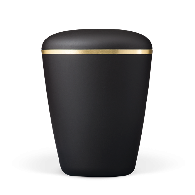 A urna biodegradável apresenta uma superfície aveludada num rico acabamento antracite. O design elegante com uma delicada fita dourada cria uma urna sofisticada para guardar as cinzas do seu ente querido.